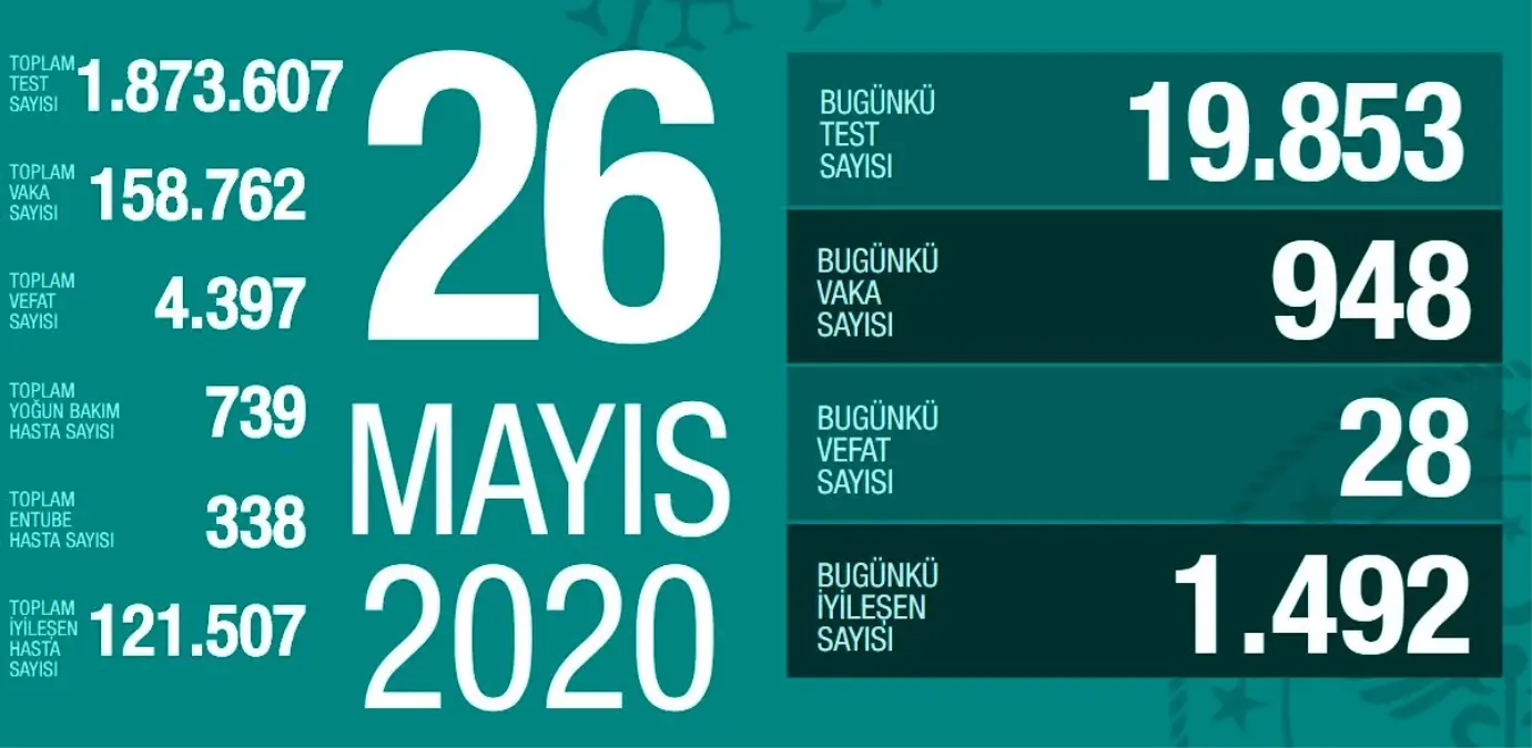 Koronavirüs sebebiyle toplam 4.249 vatandaşımız hayatını kaybetti. 151 bin 615 vaka, 4 bin 199 ölü 20 mayıs: Türkiye'de son 24 saatte 28 bin 997 vaka olduğu belirtildi. Sağlık bakanlığı tarafından paylaşılan tabloya göre, son 24 saatte 243 bin 648 koronavirüs testi yapıldı, 24 bin 733 kişinin koronavirüs test sonucu pozitif çıktı, 347 kişi hayatını kaybetti, hasta sayısı 2 bin 501 oldu. 1 mayıs korona tablosu açıklandı, vefat edenlerin sayısı dün göre düştü.